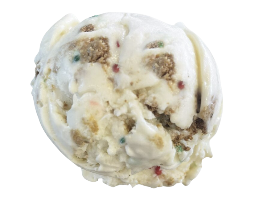 Brown sugar gingerbread ice cream swirled with white icing glaze and festive holiday sprinkles.